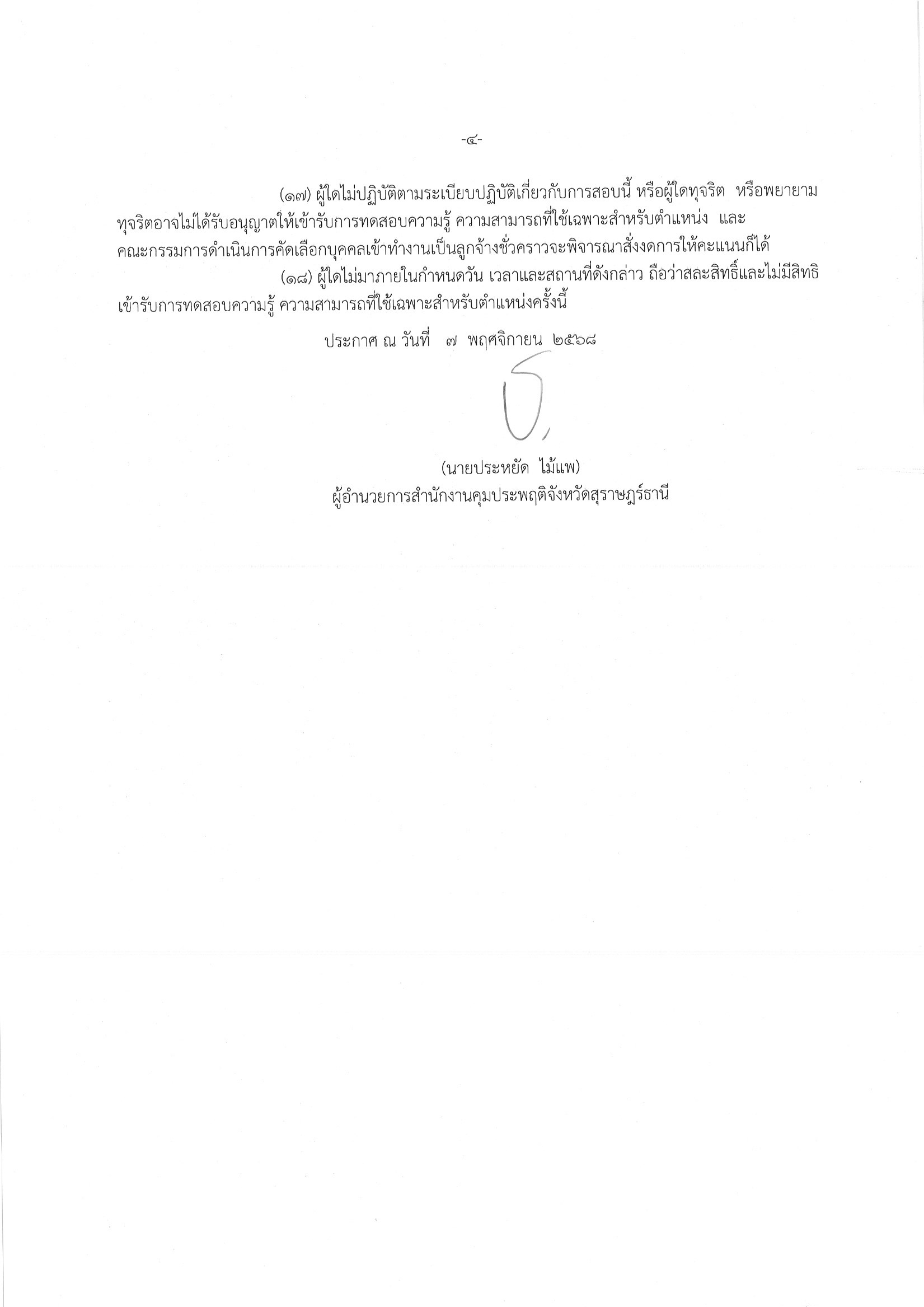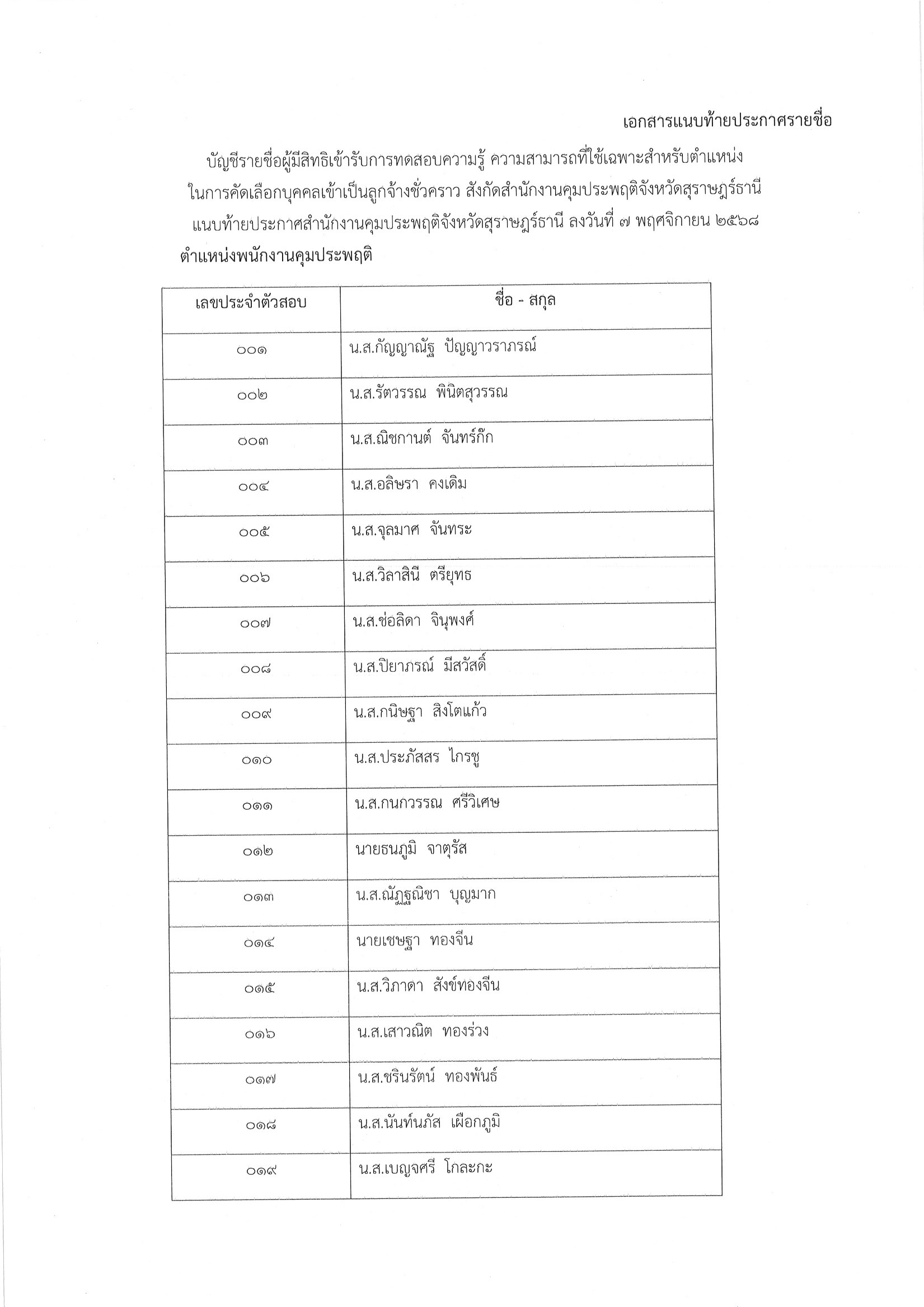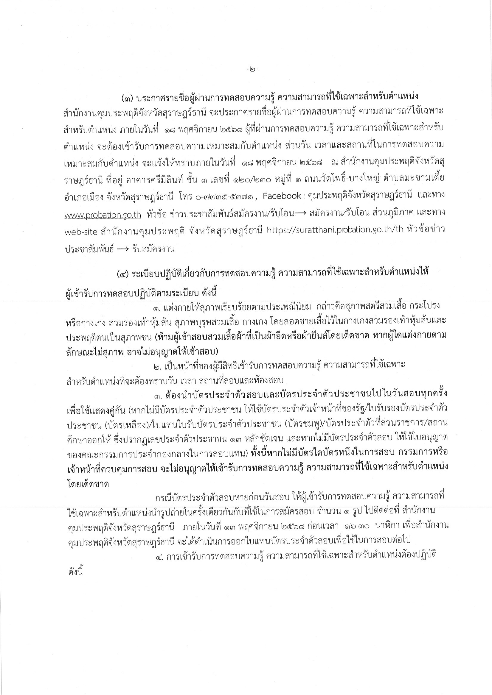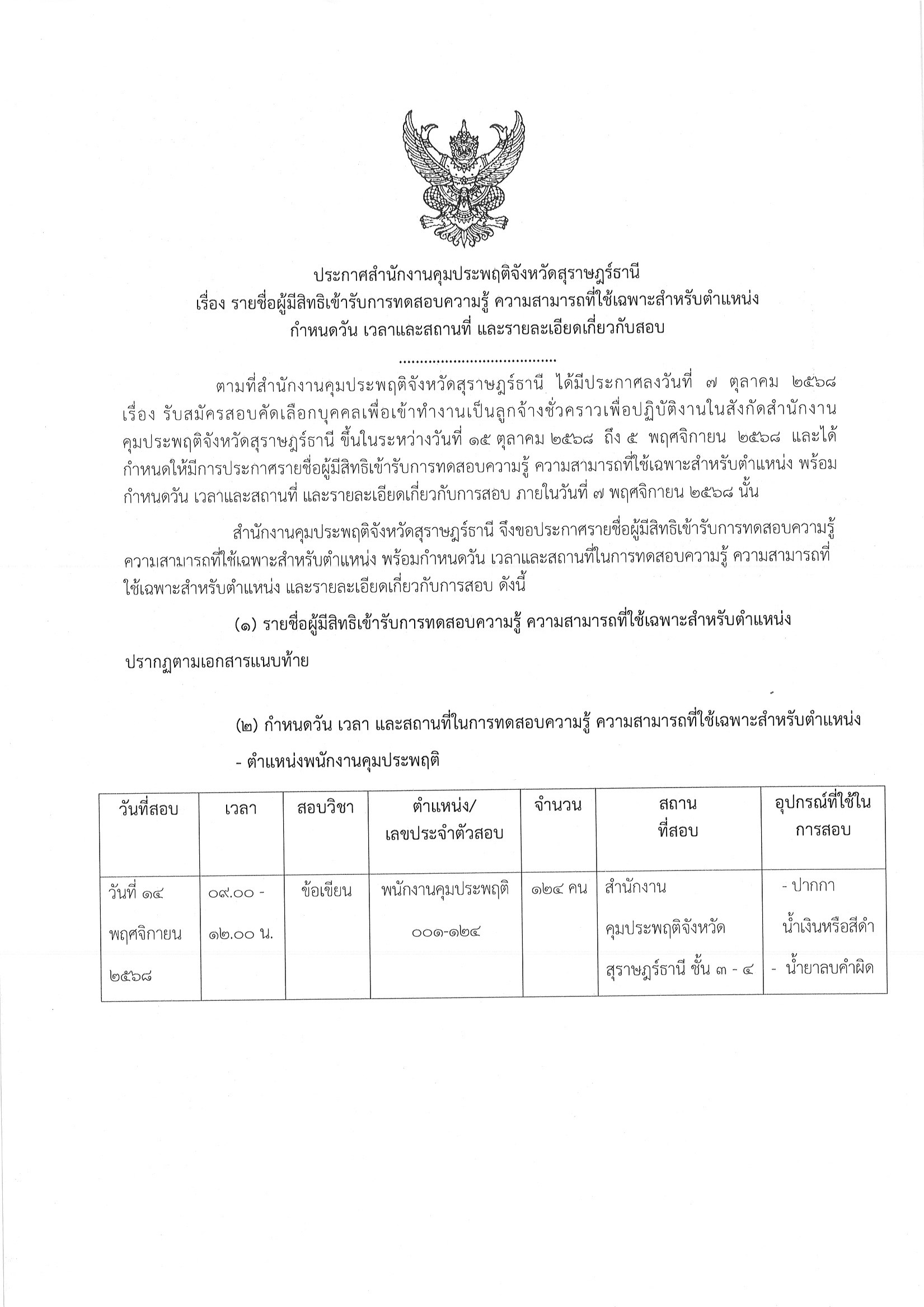 ประกาศรายชื่อผู้มีสิทธิ์เข้ารับการทดสอบความรู้ ความสามารถที่ใช้เฉพาะตำแหน่ง กำหนดวัน เวลา สถานที่และรายละเอียดเกี่ยวกับการสอบ ตำแหน่งพนักงานคุมประพฤติ
