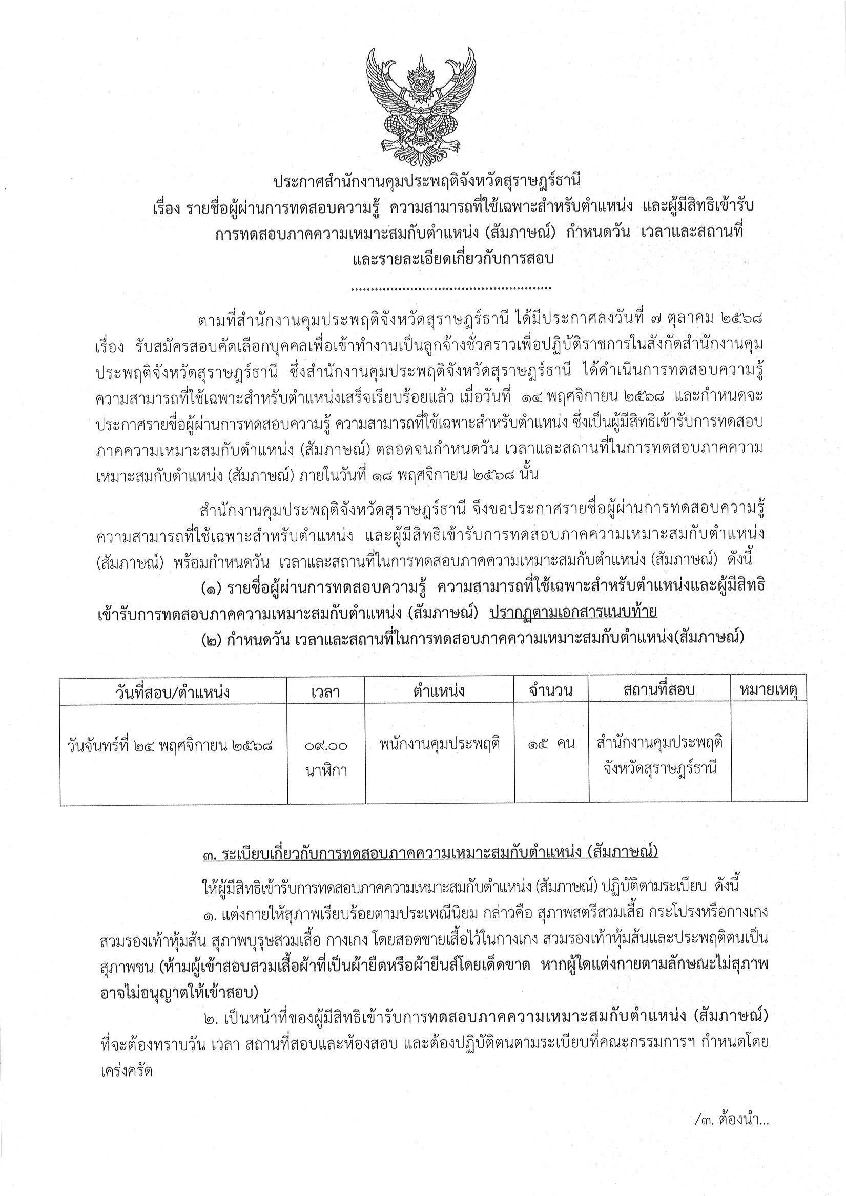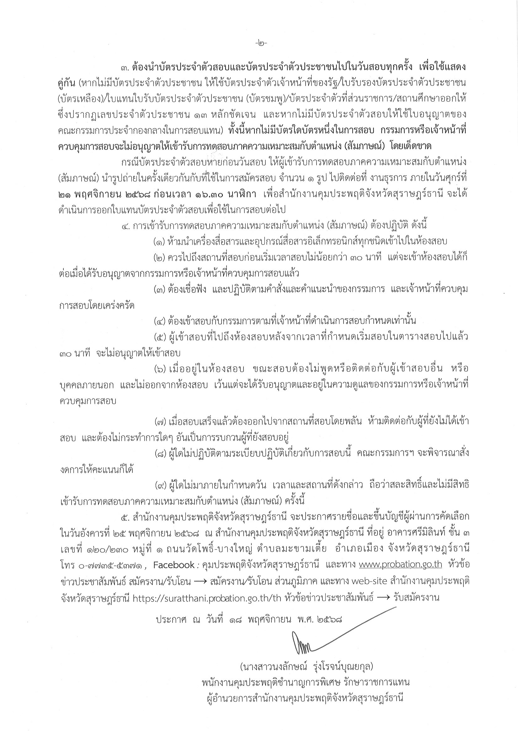 ประกาศรายชื่อผู้ผ่านการทดสอบความรู้ ความสามารถที่ใช้เฉพาะตำแหน่งและผู้มีสิทธิเข้ารับการทดสอบภาคความเหมาะสมกับตำแหน่ง (สัมภาษณ์) ตำแหน่งพนักงานคุมประพฤติ